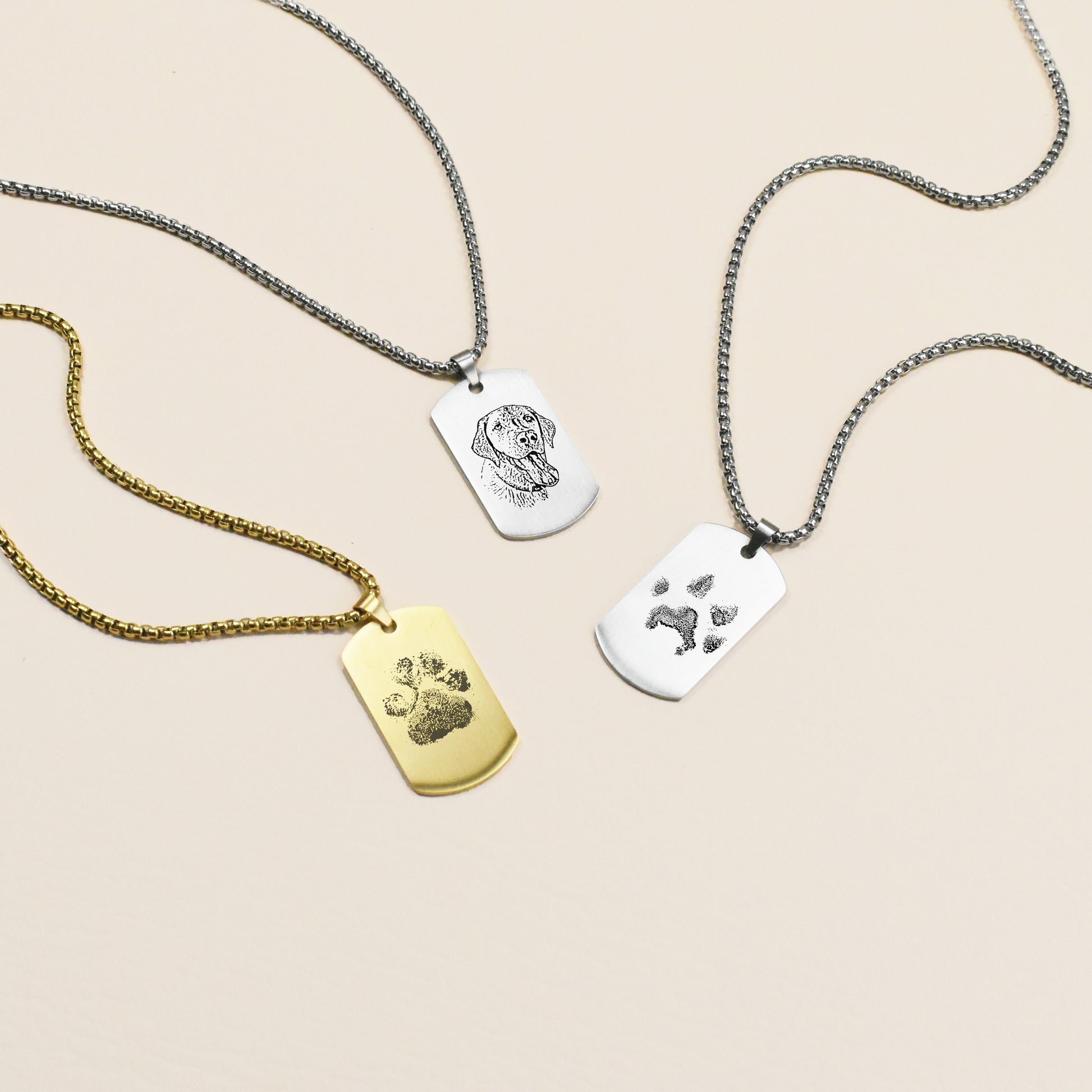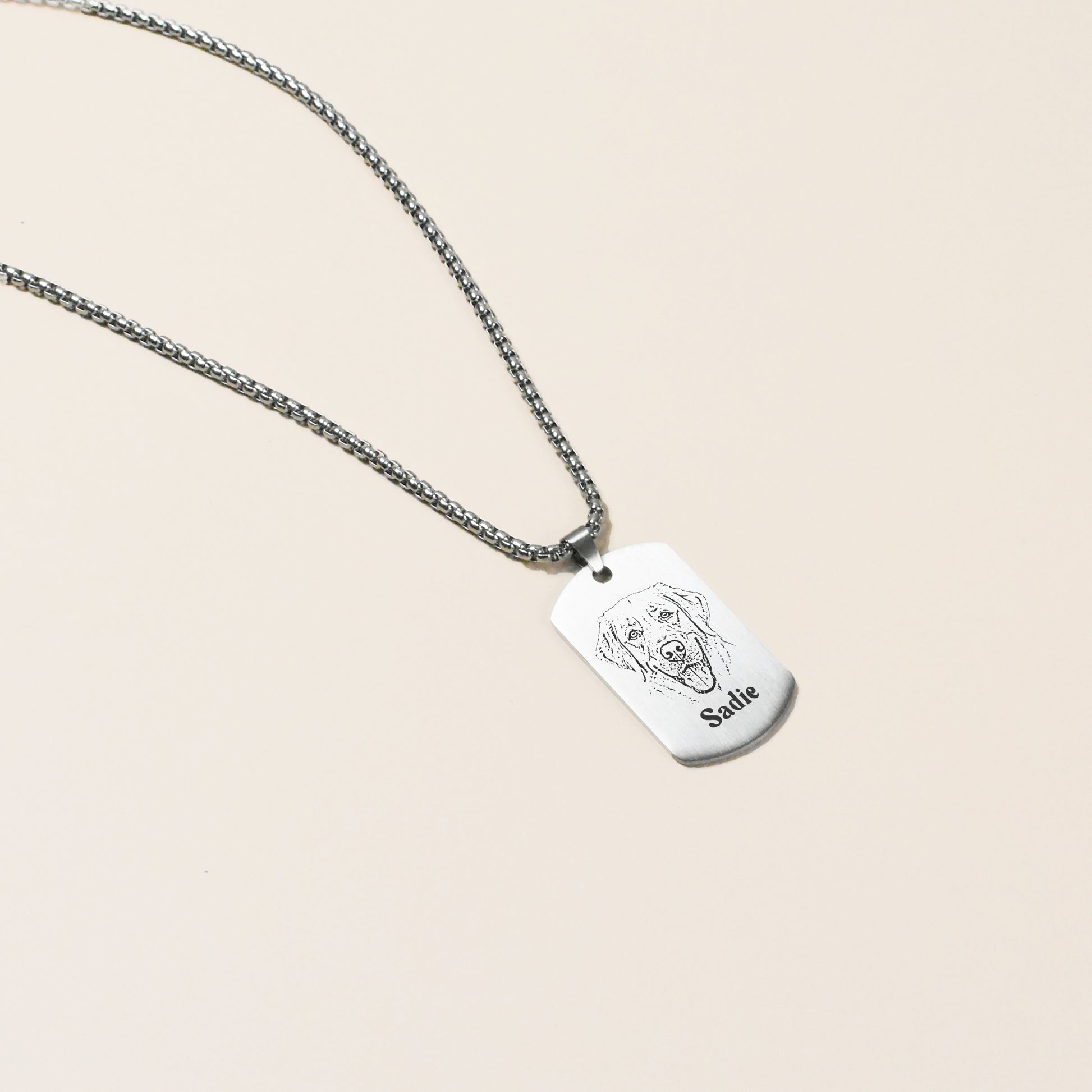 Custom Pet Portrait Men Dog Tag With Round Box Chain Personalized With Name. Available in Silver, Gold Finish.
